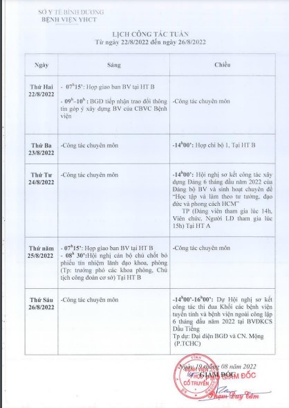 Lịch công tác tuần từ 08/08/2022 đến 12/08/2022